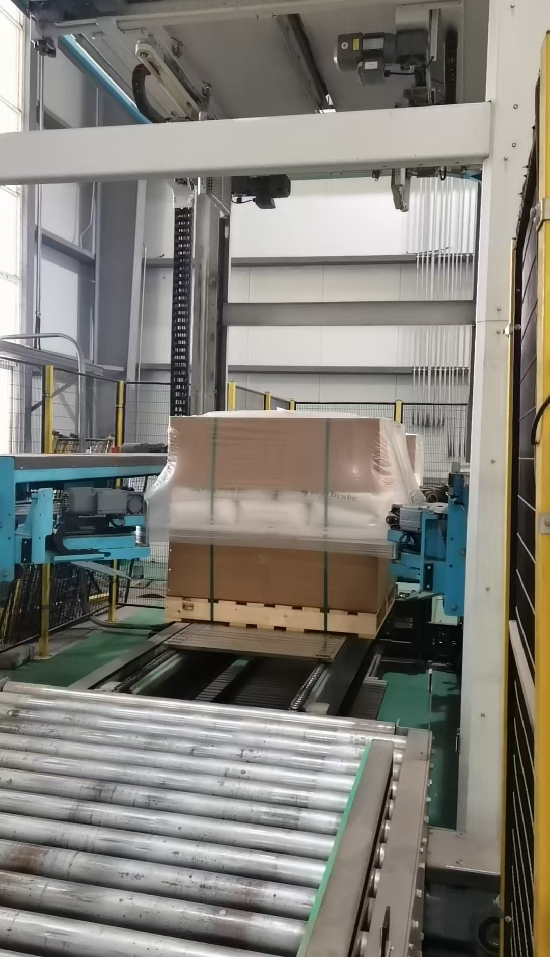 四個張力手臂,將薄膜四角拉開,自上而下套至底部,利用薄膜的高回彈力、高夾持力緊緊地包裹保護整個貨物。